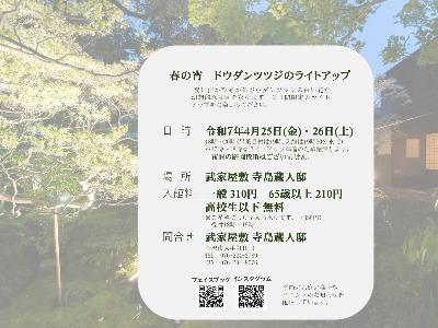 - 令和7年4月25日金曜日・26日土曜日18時~20時(呈茶受付は19時まで入館は19時30分まで) ※17時~18時はライトアップ準備のため閉館します。 夜間の庭園散策はございません。
