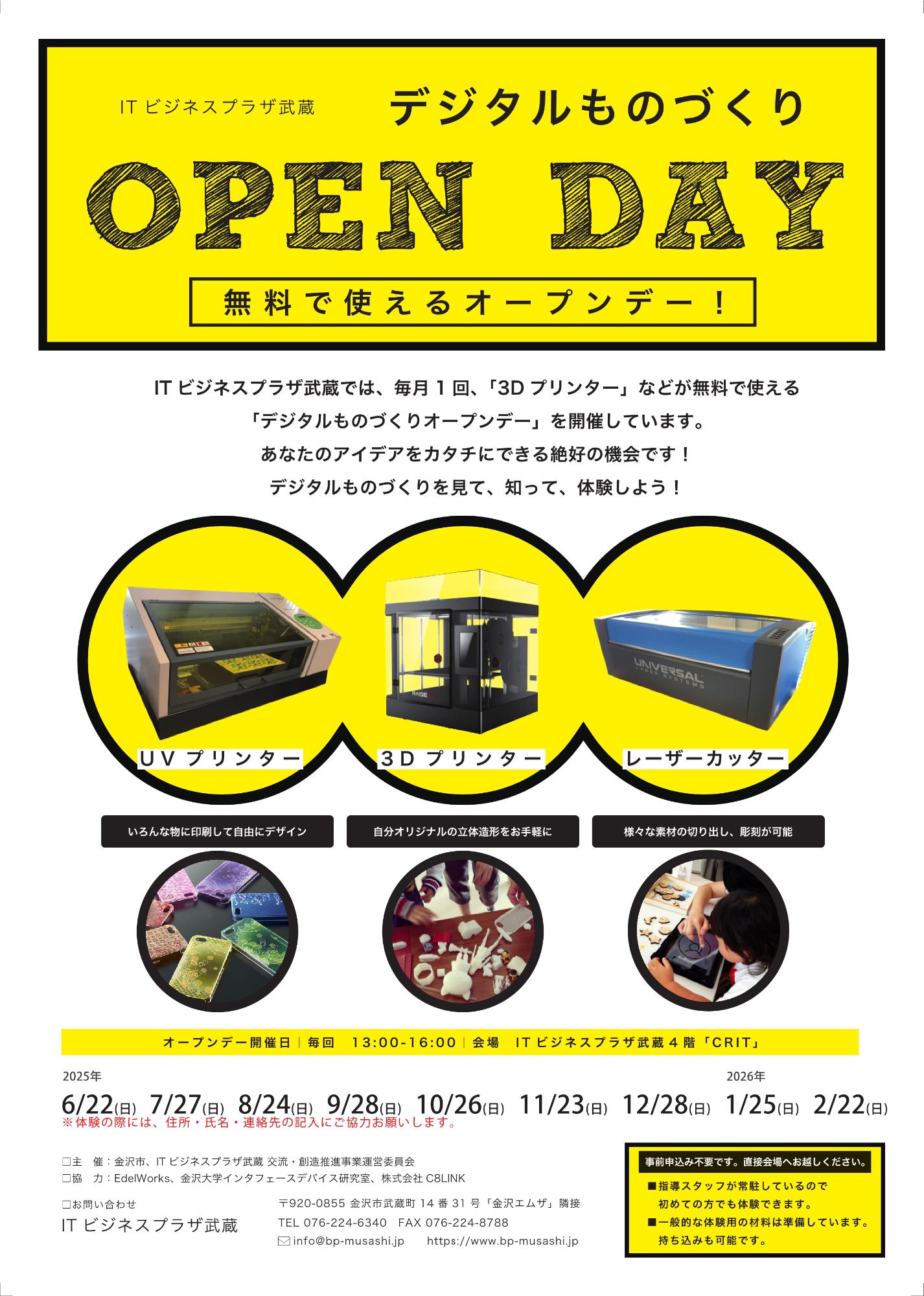 手軽にものづくりの幅が広げられる、レーザーカッターや3Dプリンター、UVプリンターが、誰でも無料で使えるオープンデーを実施します。