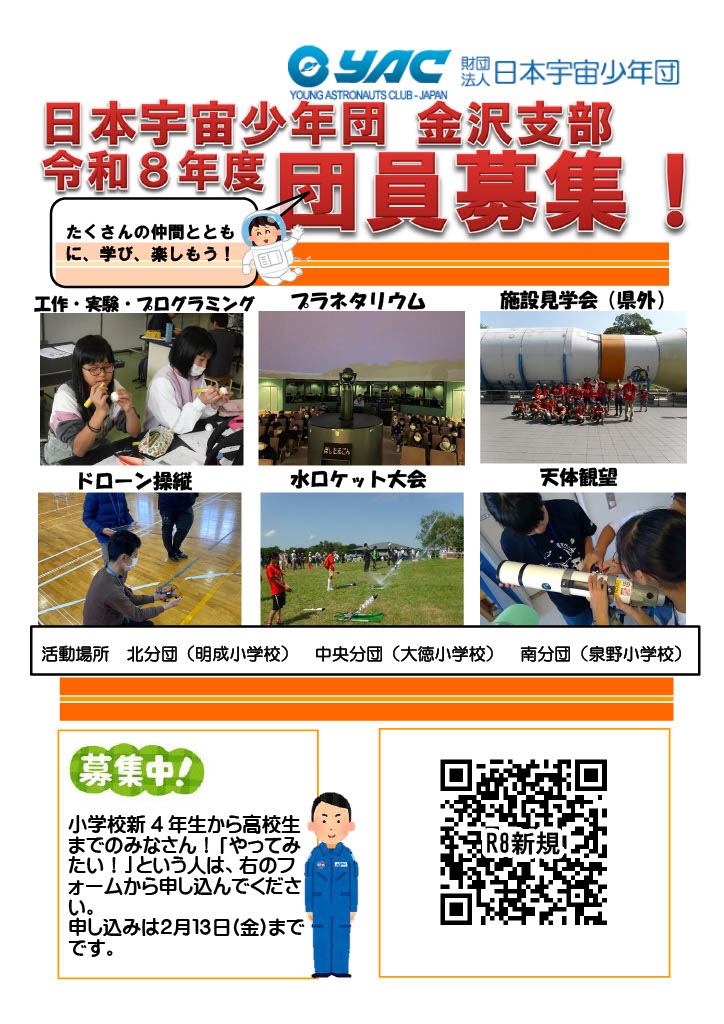 令和8年度 日本宇宙少年団 金沢支部 団員募集