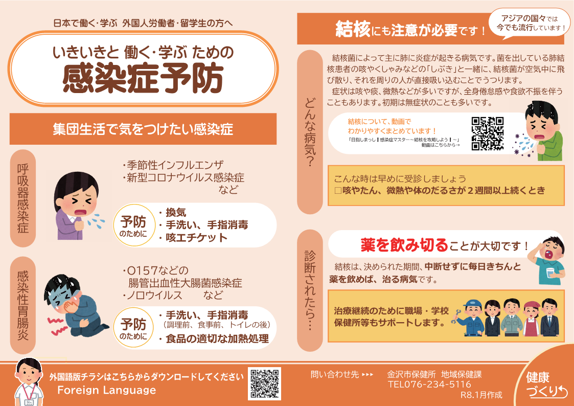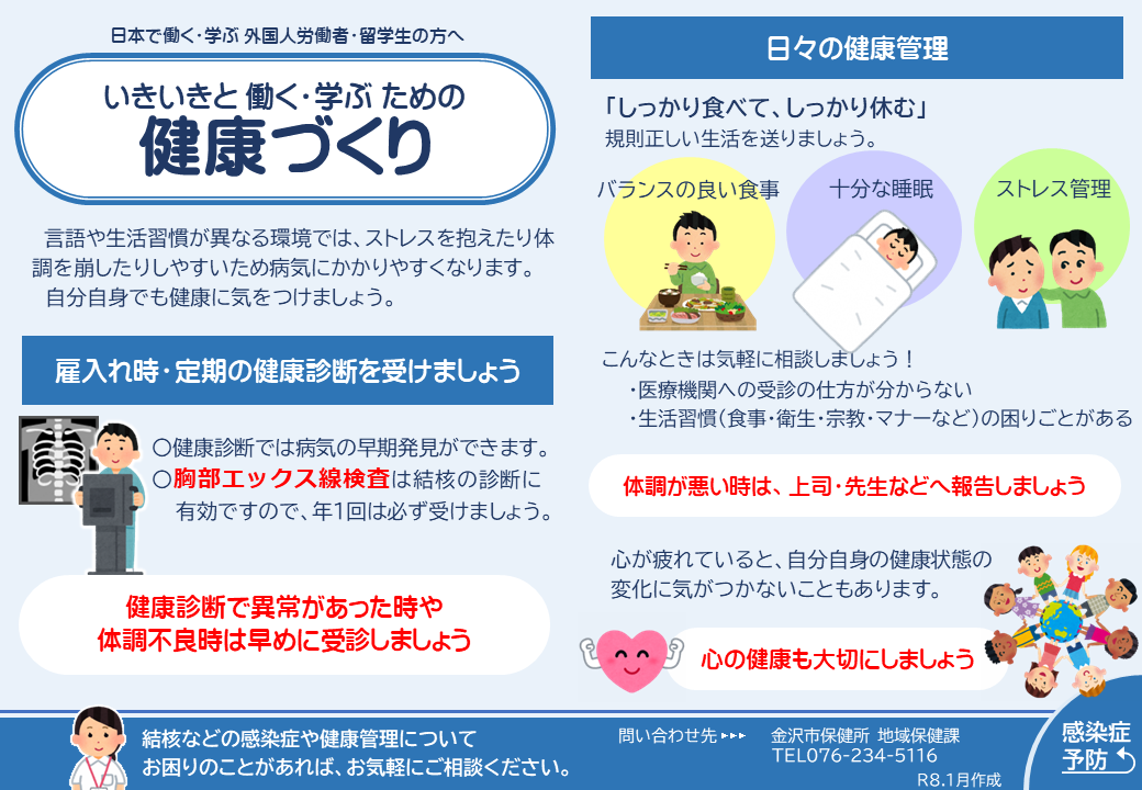 日本で生活する外国人労働者や留学生の方が、結核などの病気にかからずに、いきいきと健康で過ごすためのポイントとして「健康づくり」と「感染症対策」について、チラシにまとめました。