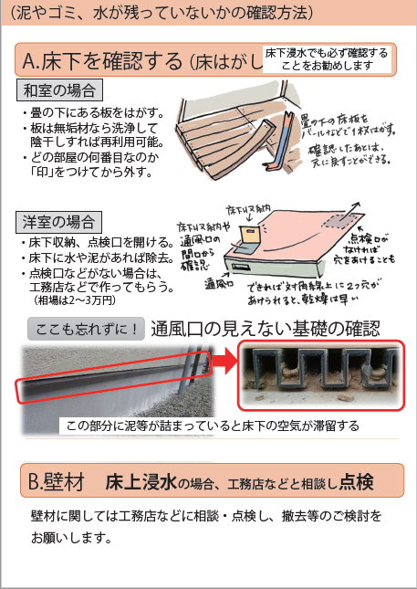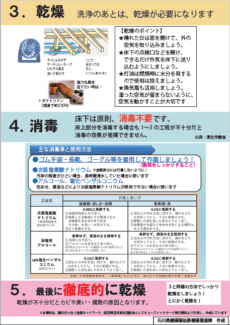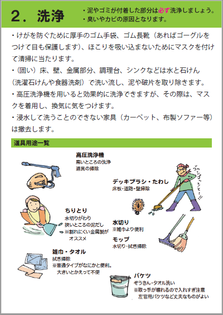災害で家屋が浸水すると、その後、細菌等が繁殖しやすい環境になり、感染症が発生する恐れがあります。