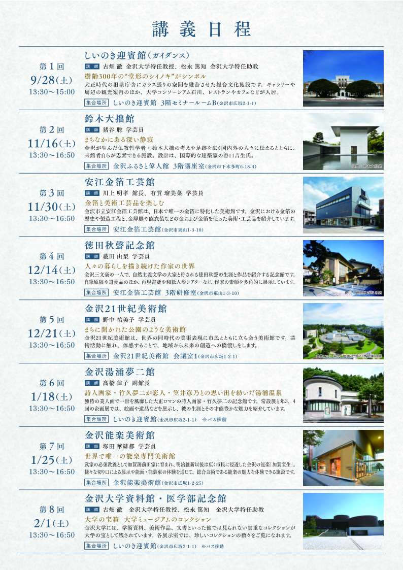 しいのき迎賓館、鈴木大拙館、安江金箔工芸館、徳田秋聲記念館、金沢21世紀美術館、金沢湯涌夢二館、金沢能楽美術館 、金沢大学資料館・医学部記念館