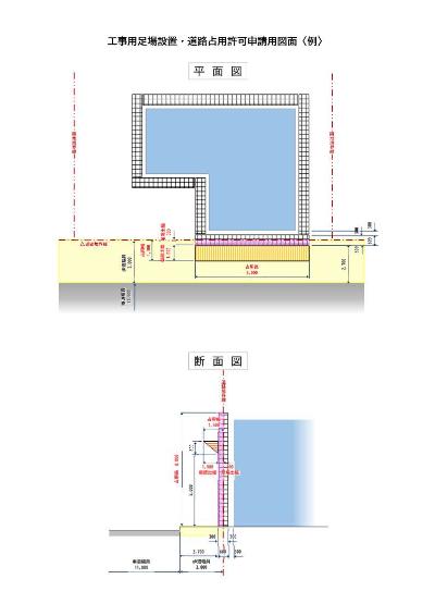 工事用の足場、敷鉄板、仮囲いなどを道路に設置する場合には、道路法第32条に従い道路占用許可を受ける必要があります(「一般占用」参照)。