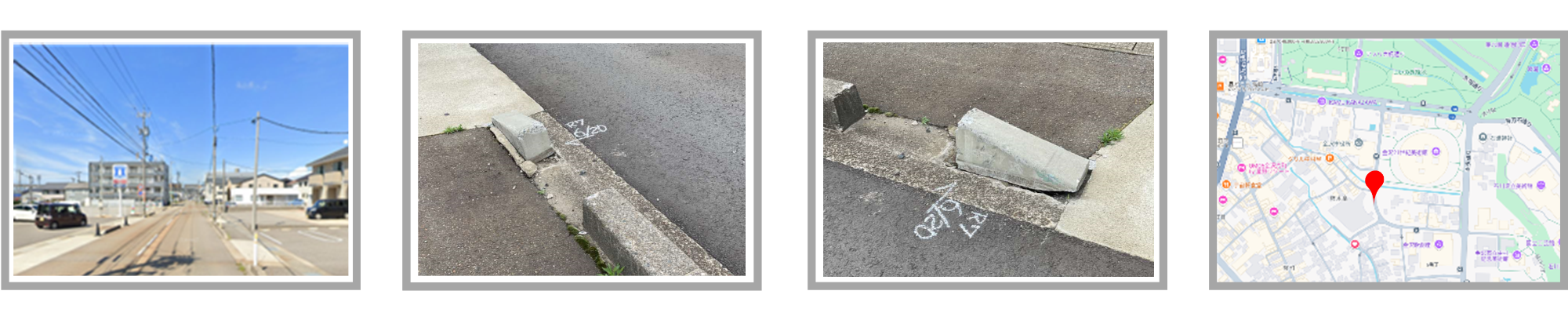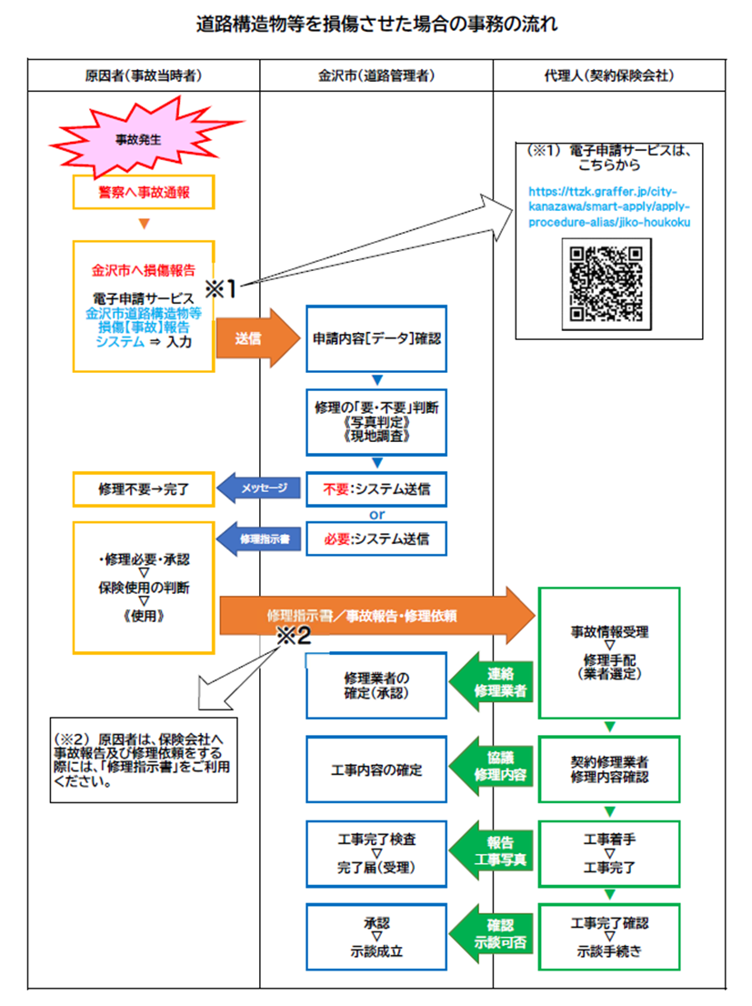 金沢市へは、金沢市電子申請サービス「金沢市道路構造物等損傷【事故】報告システム」から報告してください。