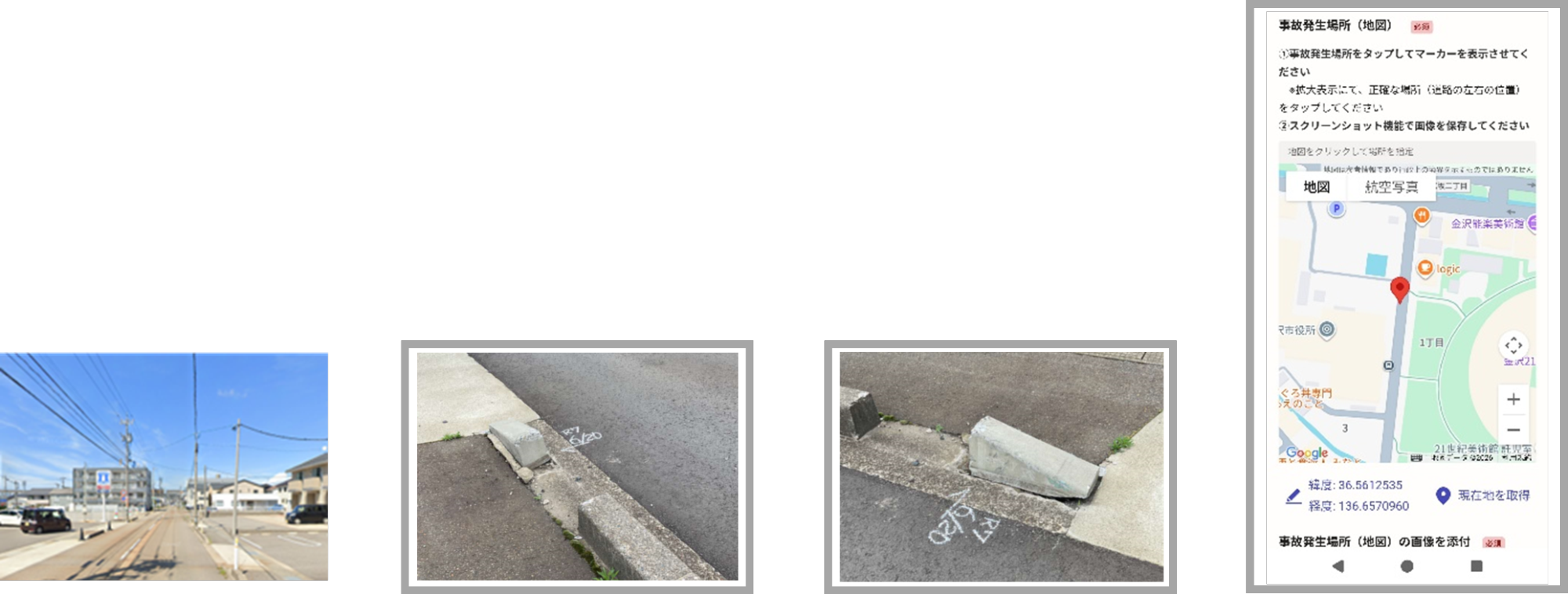 地図は、「金沢市道路構造物等損傷【事故】報告システム」入力の際、「事故発生場所(地図)」登録後のスマホ画面をスクリーンショットで画像保存