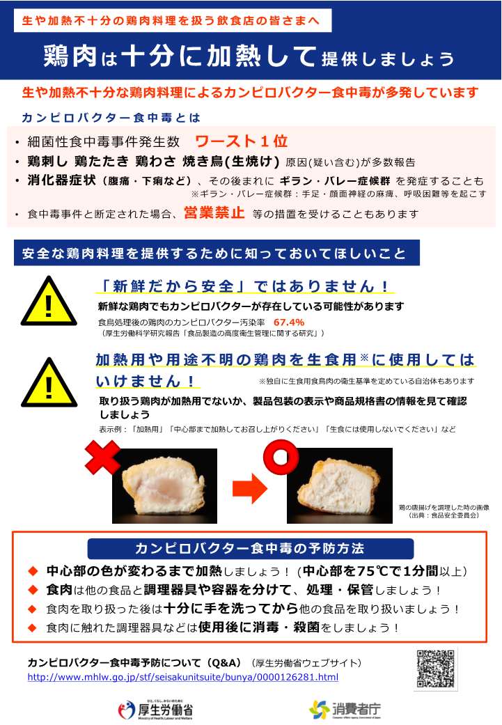 鶏の刺身や鶏のタタキなど、加熱不十分な鶏肉料理によるカンピロバクター食中毒が多発しています。また、夏は気温が高くなるため、カンピロバクタ-を含む細菌性の食中毒が発生しやすい季節です。食中毒予防のため、鶏肉をはじめ、食肉は中心まで十分に加熱してください。