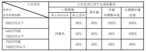 前年の合計所得金額と、り災証明書の住家の被害の程度に応じて、次表により国民健康保険料を減免します。