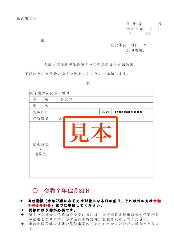 対象文書:「金沢市国民健康保険脳ドック受診助成決定通知書」