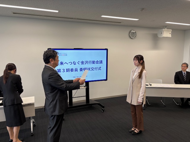 未来へつなぐ金沢行動会議の委員委嘱状交付式を行いました。第3期委員の35名には活発な意見交換のもと、まちづくりに参画いただきます。
