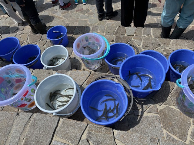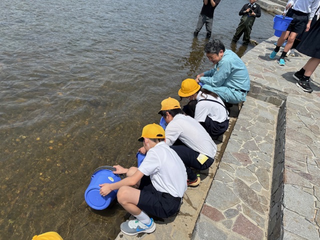 犀桜小学校5・6年生の児童と犀川に鮎の稚魚「稚鮎」約7,000尾を放流しました。