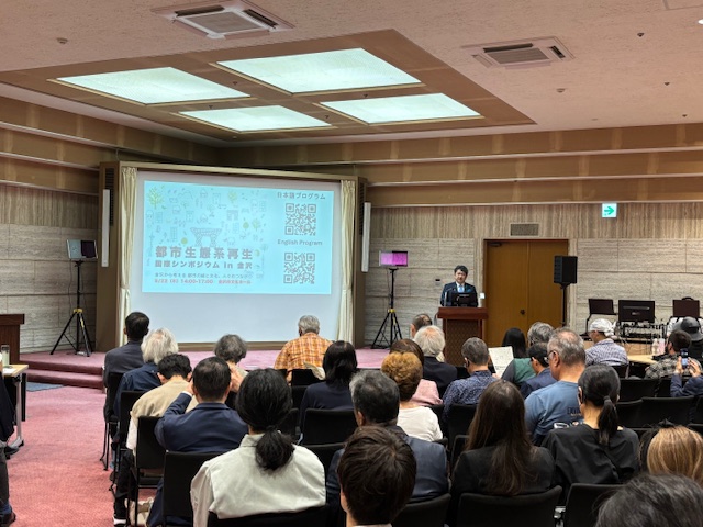 令和5年10月に国連環境計画(UNEP)から都市生態系再生モデル都市に国内で唯一認定されたことを受け、世界各都市の皆様に参加いただき、都市生態系再生国際シンポジウムin金沢を開催しました。