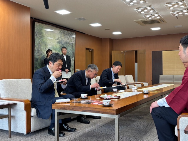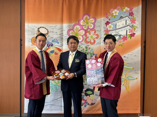 百万石まつりをイメージした和菓子の発売報告のため、石川県菓子工業組合金沢支部「菓友会」のお二人が来訪しました。