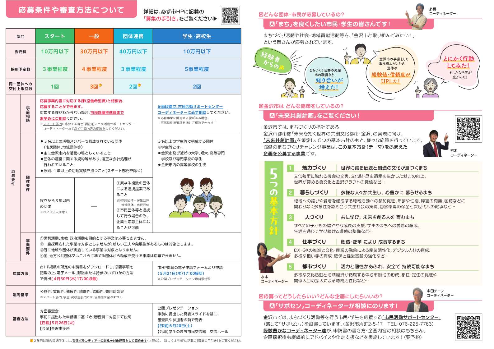 応募前に、金沢市市民活動サポートセンターのコーディネーターや、関連する行政の課に相談が必要な場合があります。