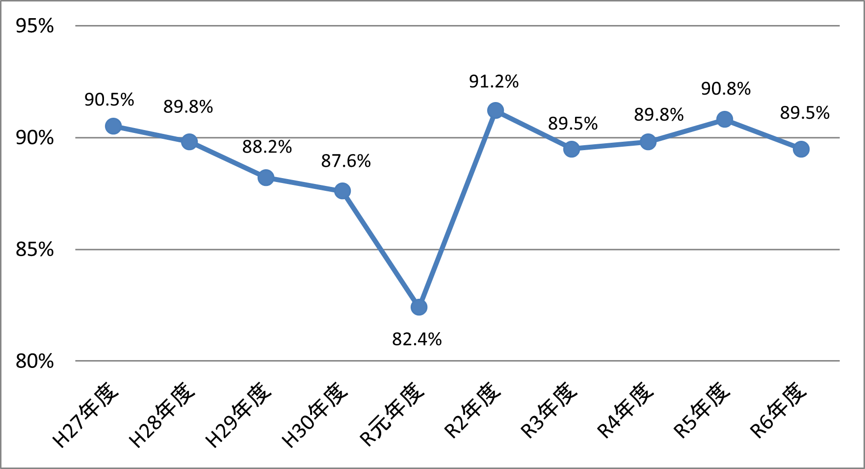 令和6年度の協定締結事業者におけるレジ袋の辞退率は、前年度に比べて1.3%減少し、89.5%となりました。