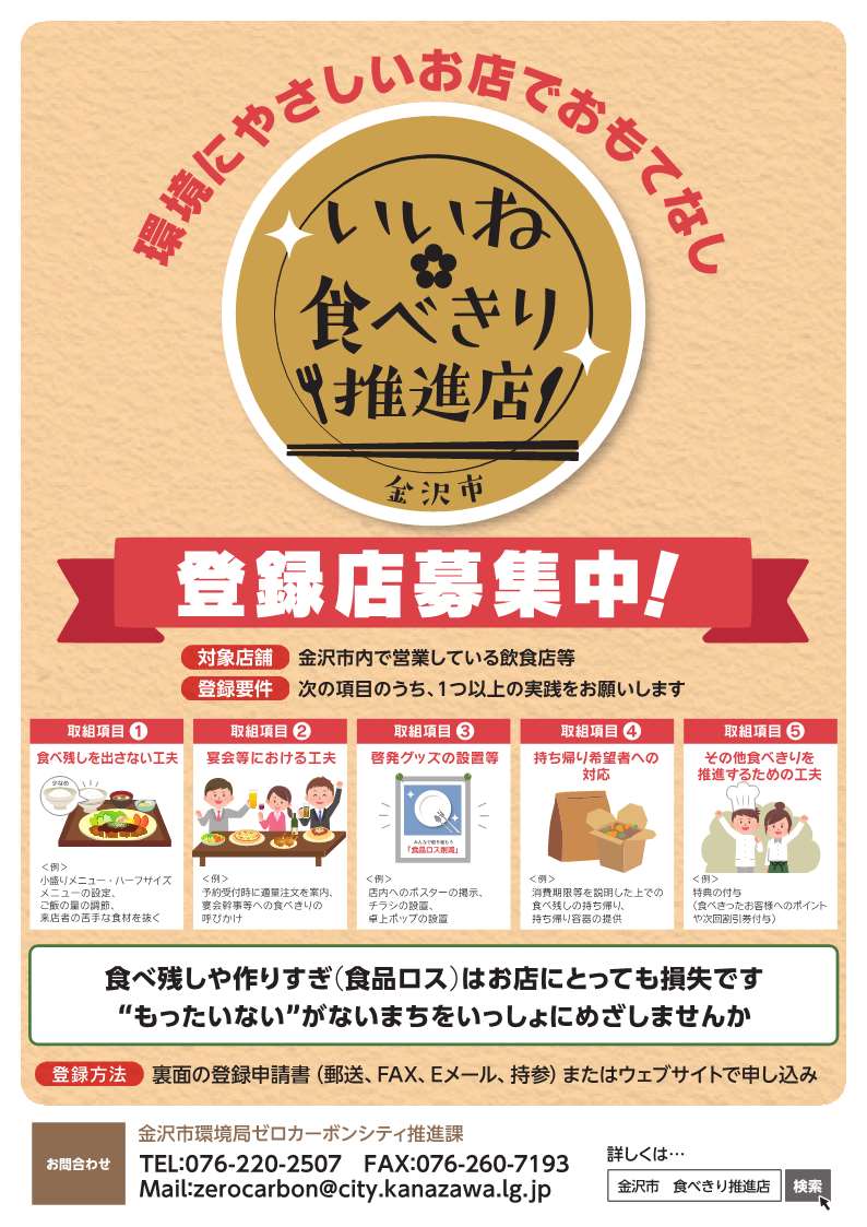 金沢市では、料理の食べ残し等の削減を実践していただいている市内の飲食店等を「いいね・食べきり推進店」として登録し、市民の皆さまの‘食べきり‘を推進する取組を実施しています。